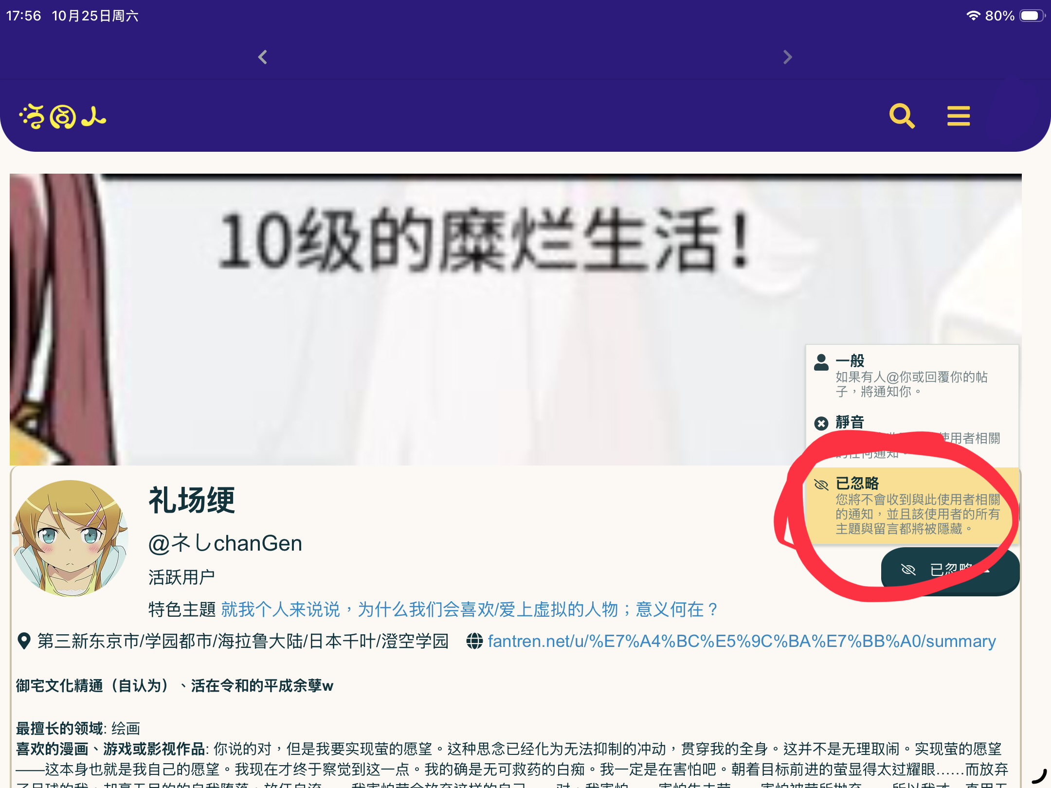 点击我的头像,进入我的个人主页,选择忽略用户就好啦