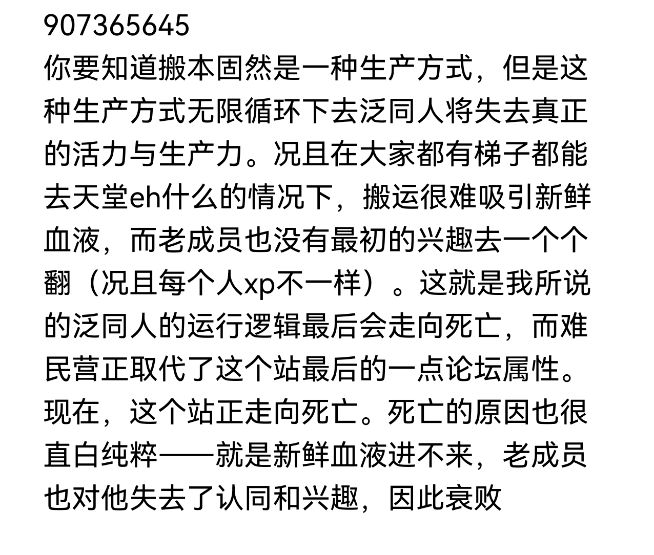 泛同人的死亡是注定的,它的运行模式就注定它不会有商业或者口碑上的成就。即便aiko在世也挽回不了这种必然的劣势,想想你是为什么还留在泛同人,当难民营已经可以承担泛同人成员的需求时(而且更主流更快捷),你为什么还在这里?